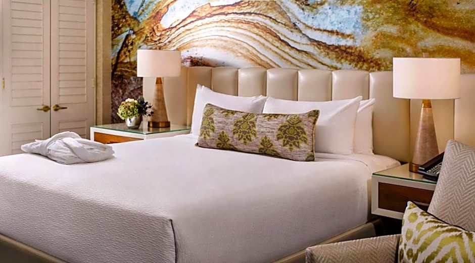 Elevate your next escape in the tranquil oasis of the King Suite, where desert-chic meets modern elegance. The 725-square-foot sanctuary showcases elegant window sheers, oversize tufted headboards and crisp white linens to offer spacious comfort with stylish amenities.